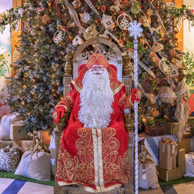 Путешествие по Терему Деда Мороза и встреча с Зимним Волшебником. Именно здесь происходит главное таинство Новогоднего праздника – общение с Дедом Морозом. В Тереме Деда Мороза, помимо Тронного зала, есть еще немало волшебных комнат, посетив которые, вы узнаете, как живется в них Деду Морозу: где он спит (спальня с резной кроватью и пуховыми перинами), в какие одежды одевается (гардеробная с удивительными сказочными нарядами), где работает (рабочий кабинет с библиотекой и обсерваторией), где хранится коллекция подарков, которые привозят Деду Морозу со всего света.